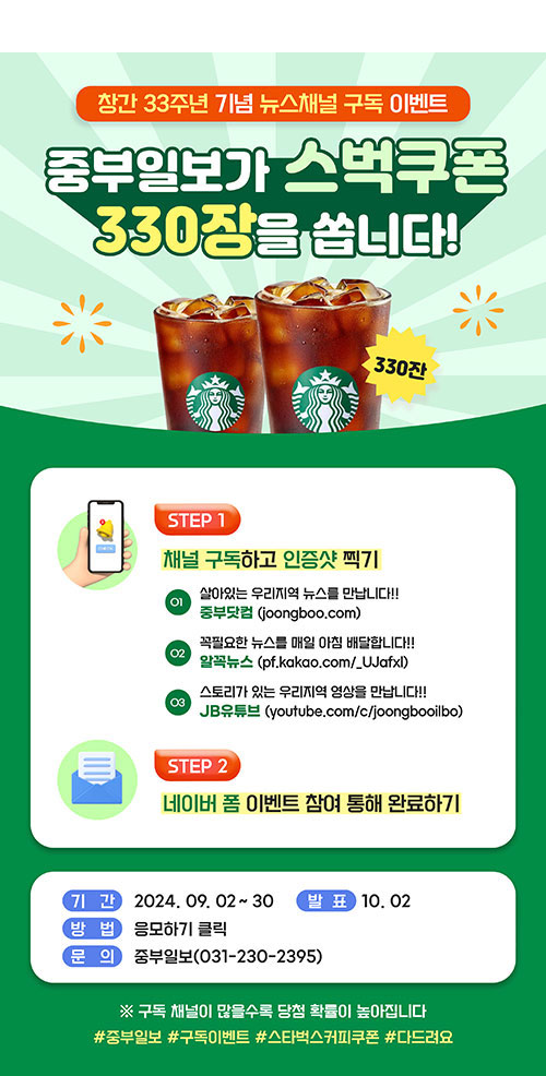 경기·인천 대표신문 중부일보가 창간 33주년 기념으로 뉴스채널 구독이벤트를 열고 스타벅스 커피 쿠폰 330장을 쏩니다!!