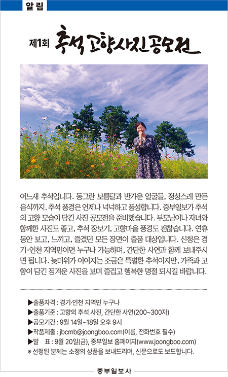 중부일보가 추석을 쇠는 고향의 모습을 사진으로 담아내는 공모전을 준비했습니다. 부모님·자녀와 함께한 사진도 좋고, 추석 장보기, 고향마을 풍경도 괜찮습니다. 연휴 동안 보고, 느끼고, 즐겼던 모든 장면이 출품 대상입니다.