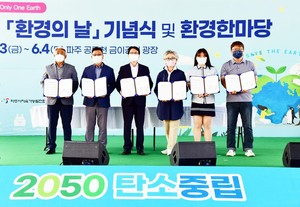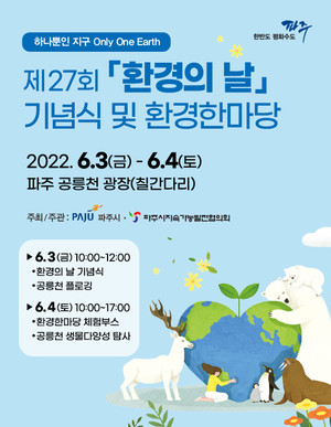 파주시는 제27회 ‘환경의 날’을 기념해 각종 행사를 개최했다고 9일 밝혔다.시는 지난 3일부터 4일까지 파주시지속가능발전협의회와 함께, 공릉천 광장에서 기념행사를 개최했다.3일에는 환경보전 유공자 표창, 탄소중립실천 서약식, 생태사진전 등 프로그램을 진행했으며, 4일에는 18개 환경한마당 체험·홍보 부스, 공릉천 생물다양성 탐사 등을 운영했다.이날 행사에는 총 1천500여 명의 시민이 참여했으며, 이 밖에 기업인, 농업인, 여성, 청소년, 환경운동 단체 등 각계 대표가 참여해 탄소중립과 지속가능한 발전을 위해 노력하겠다는 의지를