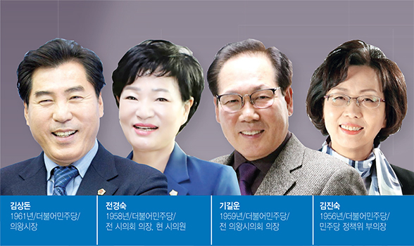 내년 6·1 전국동시지방선거를 1년여 앞두고 더불어민주당에서는 첫 ‘지역 토박이 시장’인 김상돈 현 시장과 의왕시의회 의장을 지내고 3선에 성공한 전경숙 현 시의원, 기길운 안양시청소년재단 대표이사, 김진숙 민주당 정책위 부의장이 도전장을 내밀며 물밑작업을 벌이고 있다.