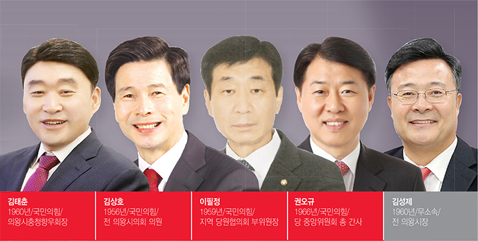 이에 맞서는 국민의힘은 김상호 전 시의원, 김태춘 의왕시충청향우회장, 이필정 의왕·과천 당원협의회 부위원장, 권오규 당 중앙위원회 총 간사 등이 자천타천 후보로 떠오르고 있다.