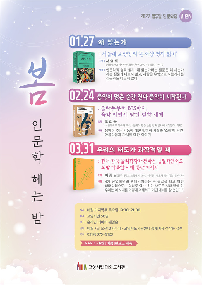 고양시 대화도서관이 2022년 시즌 6을 맞이한 ‘열두달 인문학당’ 봄편을 운영한다. 오는 27일부터 시작하는 봄편 ‘인문학 헤는 밤’은 문학, 음악 등을 주제로 총 3회 진행될 예정이다.