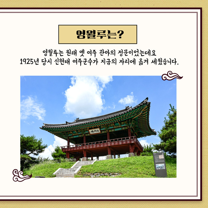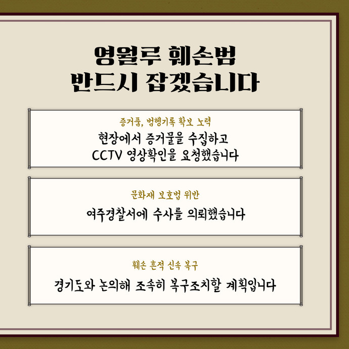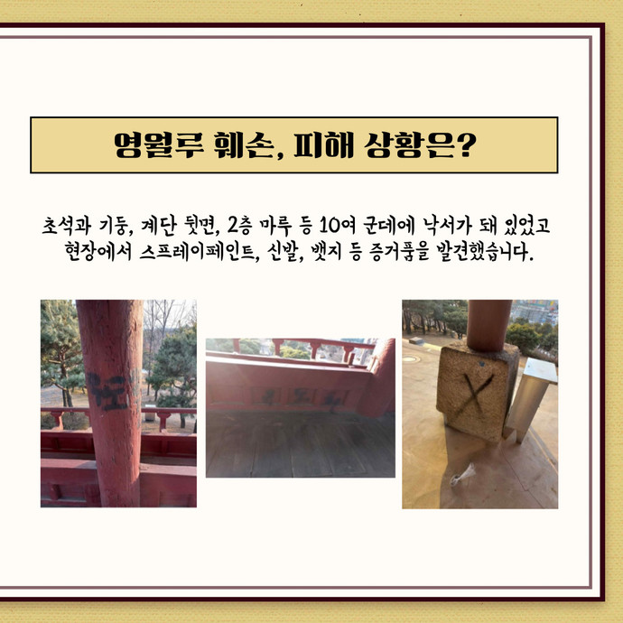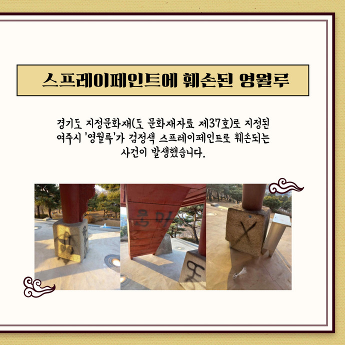 관련기사 “반드시 잡는다”… 여주시, 영월루에 스프레이 낙서 훼손 사건 발생 여주 상동 남한강변에 소재한 경기도 지정문화재가 훼손되는 사건이 발생했다.여주시는 경기도 지정문화재(도 문화재자료 제37호) ‘영월루(迎月樓)’가 검정색 스프레이페인트로 훼손된 사건이 발생했다고 4일 밝혔다.시는 지난해 12월 30일 경기도 문화재 돌봄사업단으로부터 신고를 받고 현장을 확인했다.그 결과 영월루 초석과 기둥, 계단 뒷면, 2층 마루 등 10여 군데에 걸쳐 낙서가 돼 있었고 스프레이페인트, 신발, 뱃지 등 증거품을 현장에서 발견했다.이에 시는 증거품을 수거하고 범행을 확인하기 위해 여주시 도시안전정보센터에 CCTV 영상