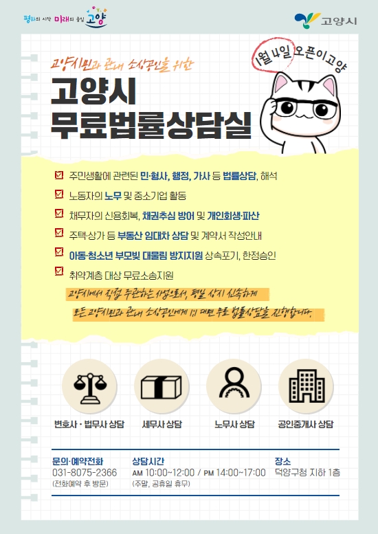 고양시 무료법률상담실은 덕양구청 지하 1층에 문을 열었다. 평일 오전 10시부터 오후 5시까지 예약제로 운영되며, 고양시민 및 관내 소상공인이라면 누구나 무료로 상담 받을 수 있다.