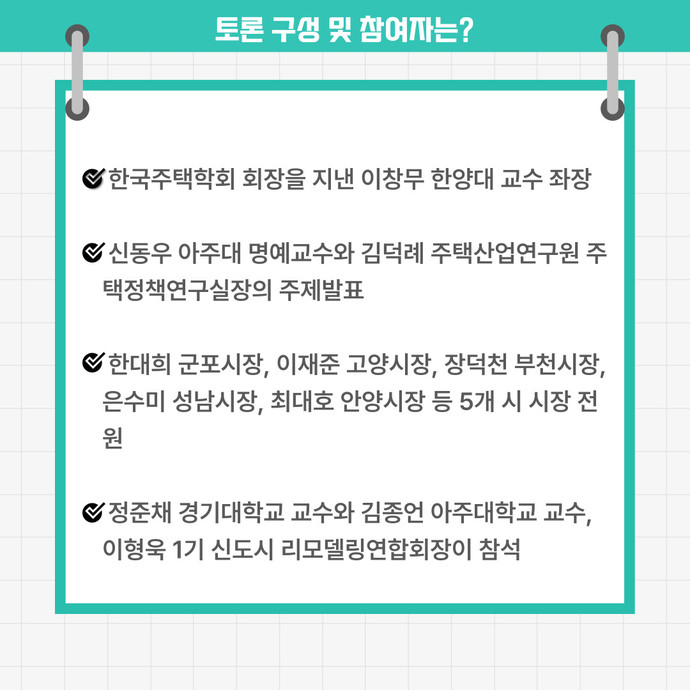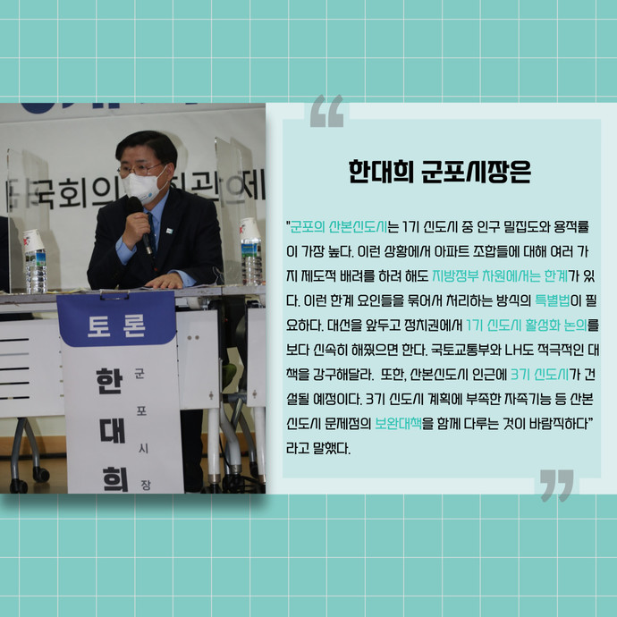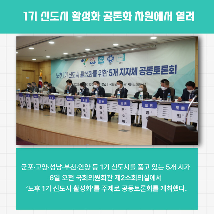 관련기사 군포·고양·성남·부천·안양 5개 시, ‘노후 1기 신도시 활성화’ 공동토론회 개최 군포시는 시를 비롯한 고양·성남·부천·안양 등 1기 신도시를 품고 있는 5개 시가 6일 오전 국회의원회관 제2소회의실에서 ‘노후 1기 신도시 활성화’를 주제로 공동토론회를 개최했다고 밝혔다.5개 시가 공동 주최한 이번 공동토론회는 지난해 12월 21일 1기 신도시 활성화 공론화 차원에서 군포시가 주최한 ‘노후 1기 신도시 활성화’ 1차 토론회에 이어서 열렸으며, 5개 시 시장이 모두 토론자로 나섰다.이날 공동토론회에서는 ▶주택공급정책▶1기 신도시의 문제점과 재생의 필요성▶각 신도시별 현안 및 활성화 대책 등이 논의됐으며, 유튜브를