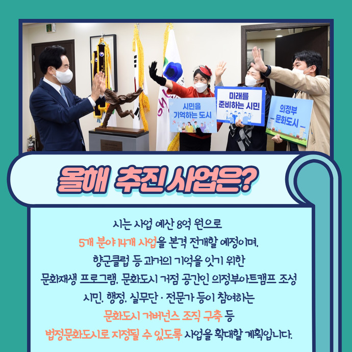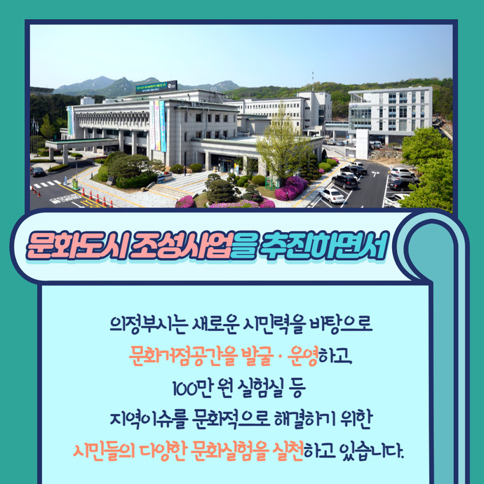 관련기사 '시민을 기억하는 도시, 미래를 준비하는 시민'…의정부시, 문화도시 추진 사업 본격 가동 의정부시가 문화도시 추진 사업을 본격 가동한다.10일 시에 따르면 지난해 12월 2일 ‘시민을 기억하는 도시, 미래를 준비하는 시민’이라는 사업명으로 문화체육관광부에서 추진하는 제4차 (예비)문화도시로 선정됐다.시는 경기북부에서 최초로 (예비)문화도시 조성사업 대상자가 됐으며, 현재까지 경기도 내에서는 수원, 부천 2개 시만이 법정 문화도시로 지정돼 있다.시는 문화도시 조성사업을 추진하면서 새로운 시민력을 바탕으로 문화거점공간을 발굴·운영하고, 100만 원 실험실 등 지역이슈를 문화적으로 해결하기 위한 시민들의 다양한 문화실험을 실