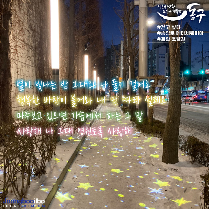 인천 동구가 주민들의 보행로 야간 환경개선사업의 일환으로 총 1억5천만 원의 사업비를 투입해 송림로 메타세쿼이아길을 ‘특화 경관 조명길’로 조성하고 특화 가로조명 설치를 완료했다.