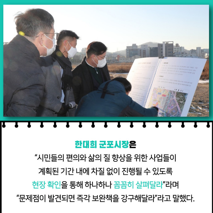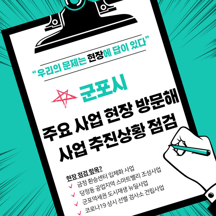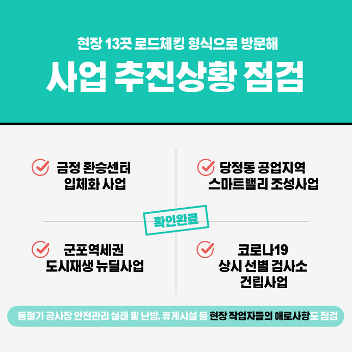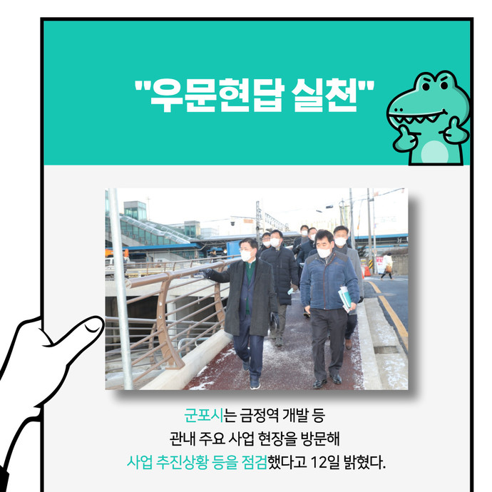 관련기사 “우문현답 실천”… 군포시, 주요 사업 현장 방문해 사업 추진상황 점검 우문현답, "우리의 문제는 현장에 답이 있다"의 준말이다. 군포시 공직자들이 종종 쓰는 말이다.사업추진과정에서 그만큼 현장점검과 확인을 중요시한다는 뜻이다.군포시는 12일 금정역 개발 등 관내 주요사업 현장을 방문해 사업 추진상황 등에 대한 점검에 나섰다.한대희 시장과 담당간부들은 이날 아침부터 ▶금정 환승센터 입체화 사업 ▶당정동 공업지역 스마트밸리 조성사업 ▶군포역세권 도시재생 뉴딜사업 ▶코로나19 상시선별검사소 건립사업 등 올해 역점사업 현장 등 13곳을 로드체킹 형식으로 방문해, 사업 추진상황을 점검하고 예상되는 문제점에 대