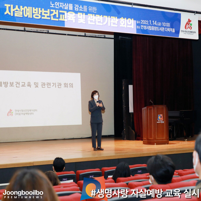 또 효과적인 자살예방을 위해 사회복지적 개입 등 통합적 관리가 이루어질 수 있도록 이날 안성시 복지정책과, 사회복지과, 건강증진과, 15개 읍면동과 안성시 종합사회복지관, 노인복지관 등이 참여해 임명호 안성시정신건강복지센터장의 자살예방 교육을 받았다. 노인자살 심각성을 인식하고 자살예방을 위한 기관별 역할에 대해 논의하기도 했다.