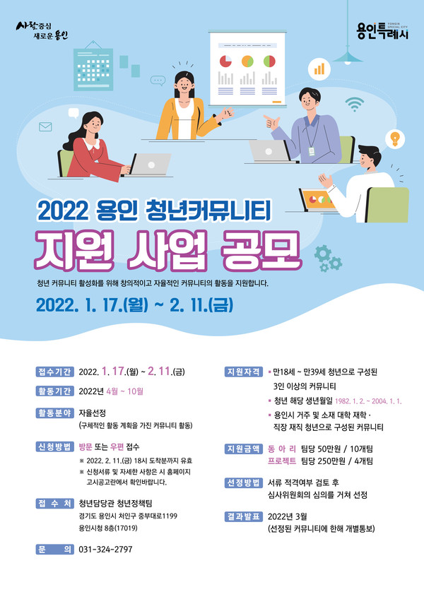 용인시는 ‘2022년 청년 커뮤니티(동아리) 지원사업에 참여할 14개팀을 모집한다고 17일 밝혔다.