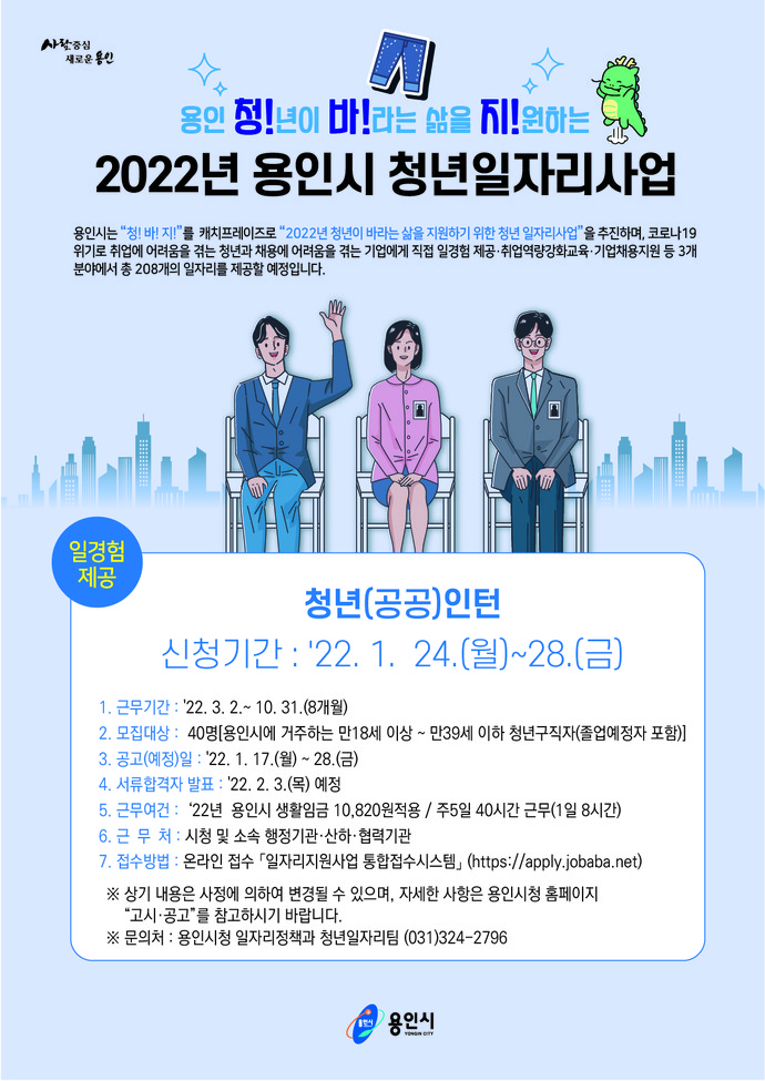 용인시가 청년 구직자에게 경력 형성 기회를 제공하기 위해 청년인턴 40명을 모집한다고 18일 밝혔다.