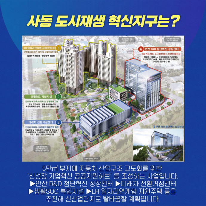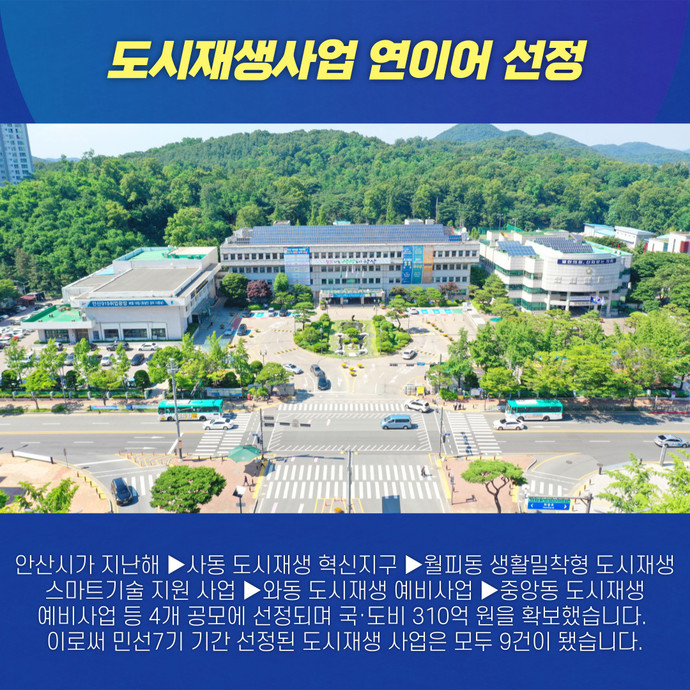 관련기사 “도시경쟁력 높이자”… 안산시, 도시재생 뉴딜사업으로 지역 균형발전 박차 안산시가 민선7기 도시재생 사업 9건에 선정돼 4천700억 원대 예산을 확보하며 지역균형발전에 박차를 가하고 있다.19일 시에 따르면 민선7기 안산시정은 공공주도 개발에서 벗어나 재생사업 계획부터 사업추진까지 주민과 함께하는 방식으로 지역공동체 회복과 도시경쟁력 향상에 전력을 기울이고 있다.이런 노력에 힘입어 지난해 ▶사동 도시재생 혁신지구(4천90억) ▶월피동 생활밀착형 도시재생 스마트기술 지원 사업(7억3천만) ▶와동 도시재생 예비사업(3억6천만) ▶중앙동 도시재생 예비사업(4억) 등 4개 공모사업에 선정돼 국·도비 310억 원
