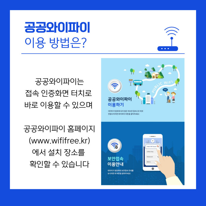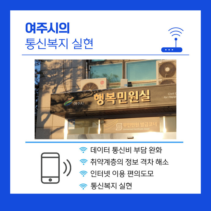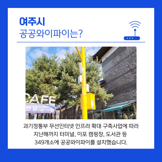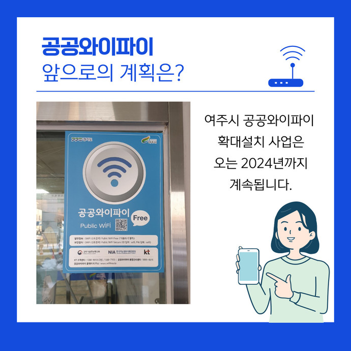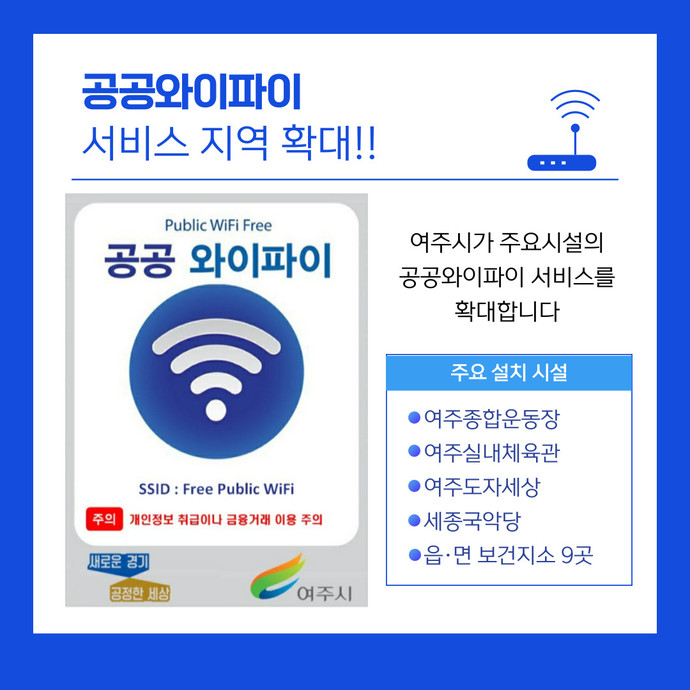 관련기사 “통신복지에 한 걸음 더”… 여주시, 공공와이파이 확대설치 여주시가 이달부터 여주종합운동장, 실내체육관, 여주도자세상(신륵사관광지), 세종국악당, 각 읍·면 보건지소 9곳 등 시민들이 자주 이용하는 시설을 대상으로 공공와이파이 서비스를 확대한다고 20일 밝혔다.이는 과학기술정보통신부 무선인터넷 인프라 확대 구축사업에 따른 것으로 지난해까지 터미널, 이포 캠핑장, 도서관 등 349개소에 공공와이파이 서비스를 설치했다.공공와이파이는 접속 인증화면 터치로 바로 이용할 수 있으며, 공공와이파이 홈페이지를 통해 설치 장소를 확인할 수 있다여주시 관계자는 “공공와이파이의 꾸준한 확대로 시민들의 데이터