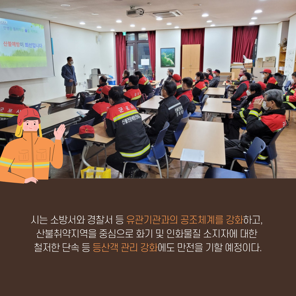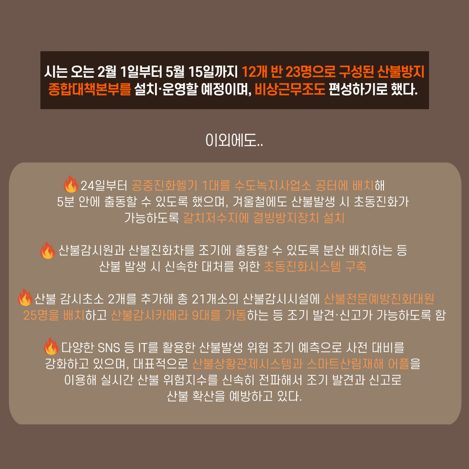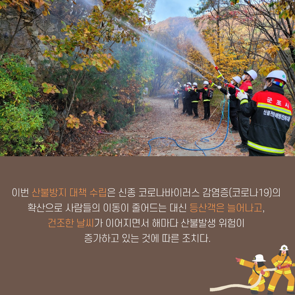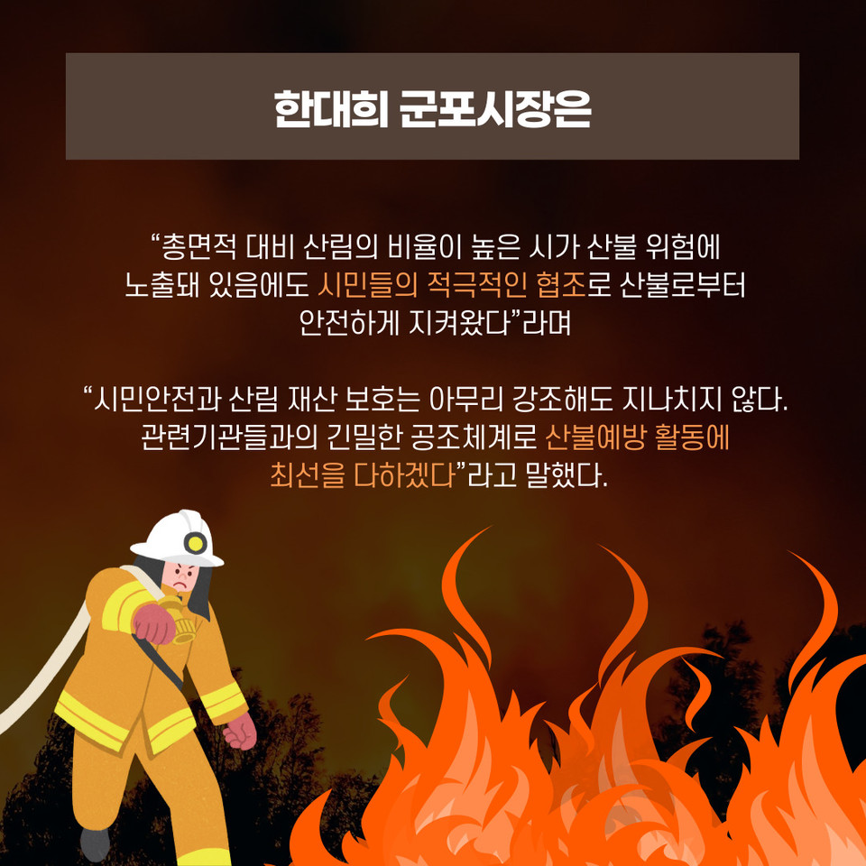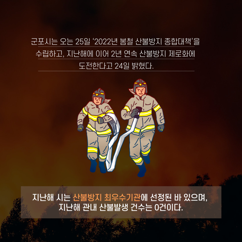 관련기사 “산림 재산 보호 위해”… 군포시, 2년 연속 산불방지 제로(Zero)화 도전 군포시가 봄철 산불방지 제로(Zero)화, 2년차 도전에 나섰다.24일 시에 따르면 최근 코로나19 확산으로 사람들의 이동이 줄어드는 대신 등산객은 늘어나고, 건조한 날씨가 이어지면서 해마다 산불발생 위험이 증가하고 있다며 산불방지 제로(Zero)화를 위한 2년차에 도전한다고 밝혔다.군포시는 이에 따라, 효과적인 초기 대응으로 산불발생 및 피해를 최소화하기 위한 봄철 산불방지 제로(Zero)화 2년차 도전 대책을 마련했다.지난해 산불방지 최우수기관에 선정된 군포시는 1월 25일 ‘2022년 봄철 산불방지 종합대책’을 수립하고, 지난