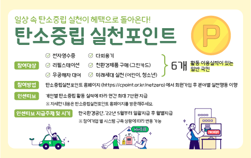 탄소중립 실천포인트 제도는 전자영수증, 리필스테이션, 무공해차 대여, 친환경제품 구매(그린카드), 다회용기(배달) 사용 등 탄소중립 실천 실적에 따라 인센티브를 지급하는 것을 말한다.