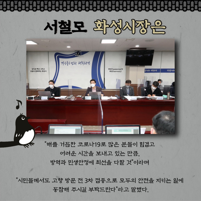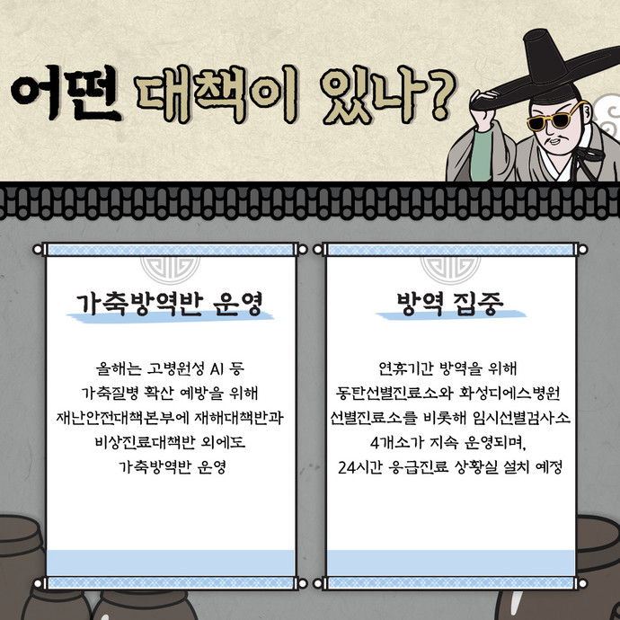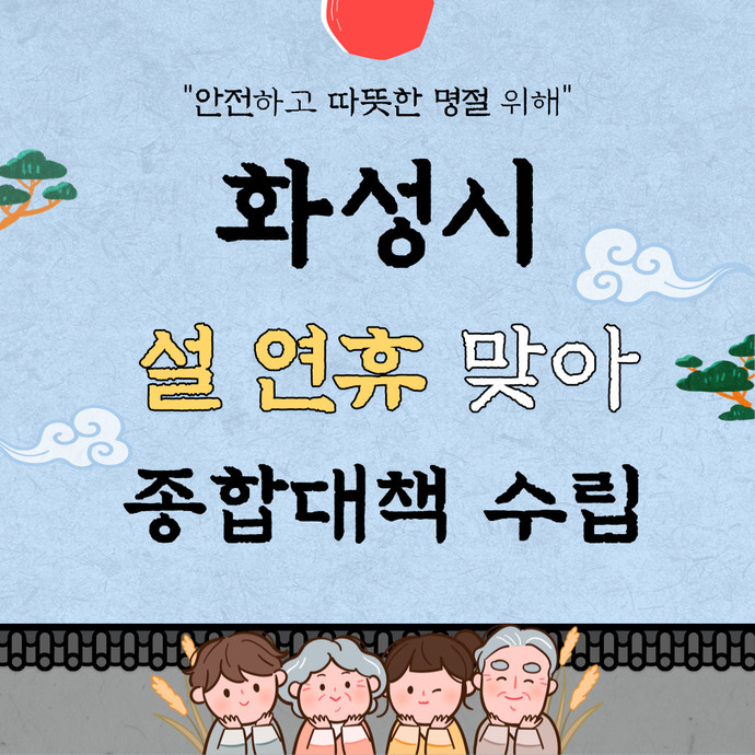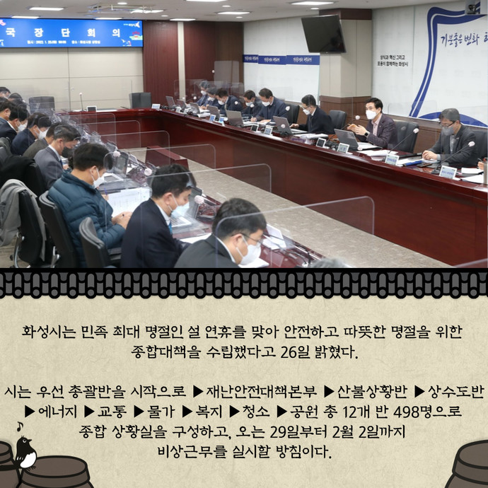 관련기사 “안전하고 따뜻한 명절 위해”… 화성시, 설 연휴 맞아 종합대책 수립 화성시는 민족 최대 명절인 설 연휴를 맞아 안전하고 따뜻한 명절을 위한 종합대책을 수립했다고 26일 밝혔다.시는 우선 총괄반을 시작으로 ▶재난안전대책본부 ▶산불상황반 ▶상수도반 ▶에너지 ▶교통 ▶물가 ▶복지 ▶청소 ▶공원 총 12개 반 498명으로 종합 상황실을 구성하고, 오는 29일부터 2월 2일까지 비상근무를 실시할 방침이다.올해는 고병원성 AI 등 가축질병 확산 예방을 위해 재난안전대책본부에 재해대책반과 비상진료대책반 외에도 가축방역반이 운영된다.또한, 연휴기간 방역을 위해 동탄선별진료소와 화성디에스병원 선별진료소를 비롯해 임