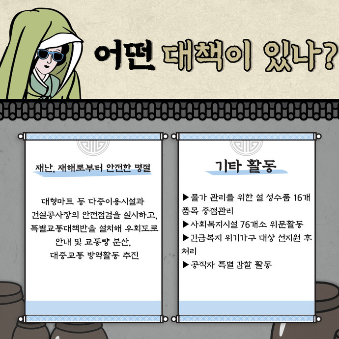 관련기사 “안전하고 따뜻한 명절 위해”… 화성시, 설 연휴 맞아 종합대책 수립 화성시는 민족 최대 명절인 설 연휴를 맞아 안전하고 따뜻한 명절을 위한 종합대책을 수립했다고 26일 밝혔다.시는 우선 총괄반을 시작으로 ▶재난안전대책본부 ▶산불상황반 ▶상수도반 ▶에너지 ▶교통 ▶물가 ▶복지 ▶청소 ▶공원 총 12개 반 498명으로 종합 상황실을 구성하고, 오는 29일부터 2월 2일까지 비상근무를 실시할 방침이다.올해는 고병원성 AI 등 가축질병 확산 예방을 위해 재난안전대책본부에 재해대책반과 비상진료대책반 외에도 가축방역반이 운영된다.또한, 연휴기간 방역을 위해 동탄선별진료소와 화성디에스병원 선별진료소를 비롯해 임 ■ 당신의 제보가 뉴스가 됩니다. ▷즉시제보 : joongboo.com/jebo ▷카카오톡 : 'jbjebo' 검색해 채널 추가 ▷전화(사회부) : 031-230-2330 *네이버, 카카오, 유튜브에서도 중부일보를 구독하세요! 저작권자 © 중부일보 - 경기·인천의 든든한 친구 무단전재 및 재배포 금지 로그인하면 내지역 뉴스와 원본 지면을 보실 수 있습니다. 회원가입 로그인 댓글삭제 삭제한 댓글은 다시 복구할 수 없습니다. 그래도 삭제하시겠습니까? 비밀번호 닫기 기사 댓글 0 댓글 접기 로그인 후 이용 가능합니다. 댓글 내용입력 비회원 로그인 이름 비밀번호 댓글 내용입력 댓글쓰기 계정을 선택하시면 로그인·계정인증을 통해 댓글을 남기실 수 있습니다. 회원 로그인 비회원 글쓰기 이름 비밀번호 자동등록방지 로그인 옵션 창닫기