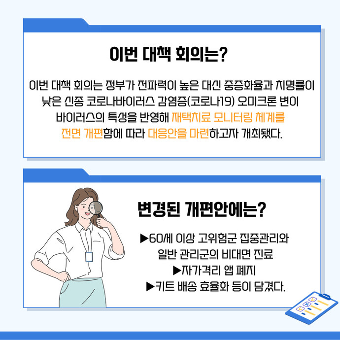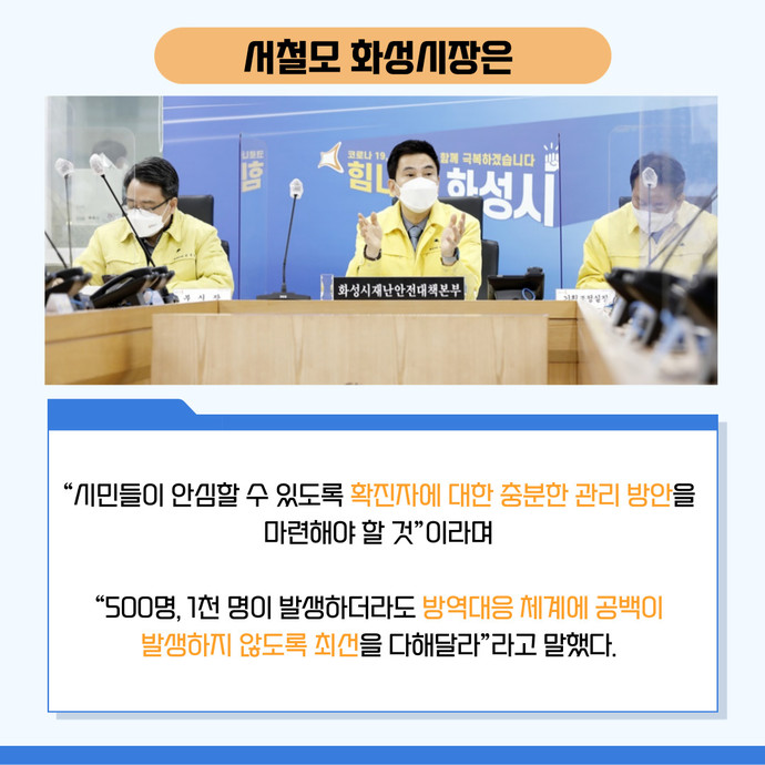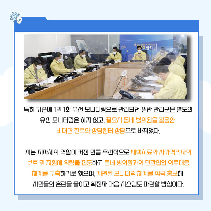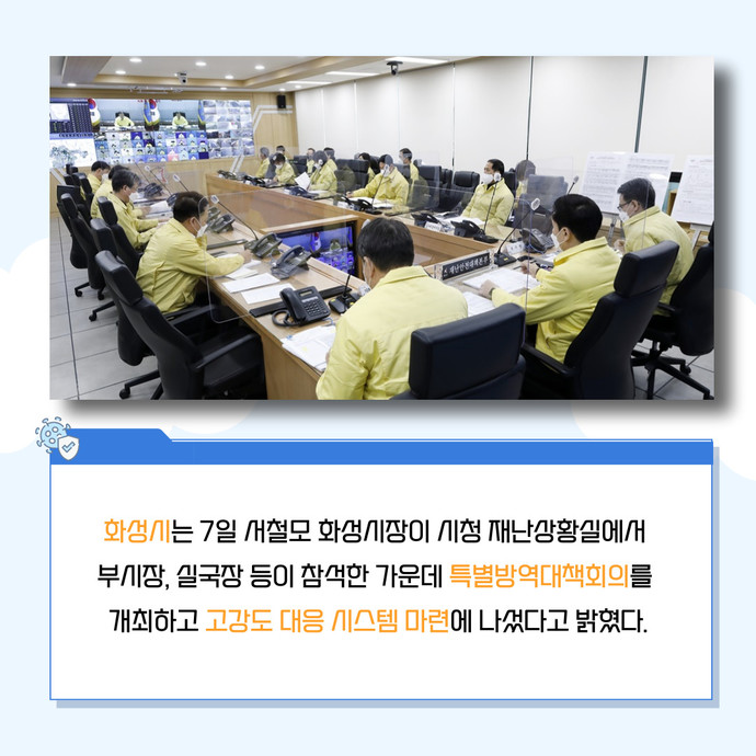 관련기사 화성시, 고강도 대응 시스템 마련 위해 특별방역대책회의 개최 화성시는 7일 서철모 화성시장이 시청 재난상황실에서 부시장, 실국장 등이 참석한 가운데 특별방역대책회의를 개최하고 고강도 대응 시스템 마련에 나섰다고 밝혔다.이번 대책 회의는 정부가 전파력이 높은 대신 중증화율과 치명률이 낮은 신종 코로나바이러스 감염증(코로나19) 오미크론 변이 바이러스의 특성을 반영해 재택치료 모니터링 체계를 전면 개편함에 따라 대응안을 마련하고자 개최됐다.변경된 개편안에는 ▶60세 이상 고위험군 집중관리와 일반 관리군의 비대면 진료 ▶자가격리 앱 폐지 ▶키트 배송 효율화 등이 담겼다.특히 기존에 1일 1회 유선