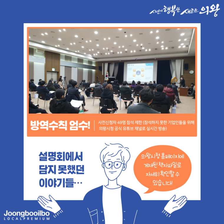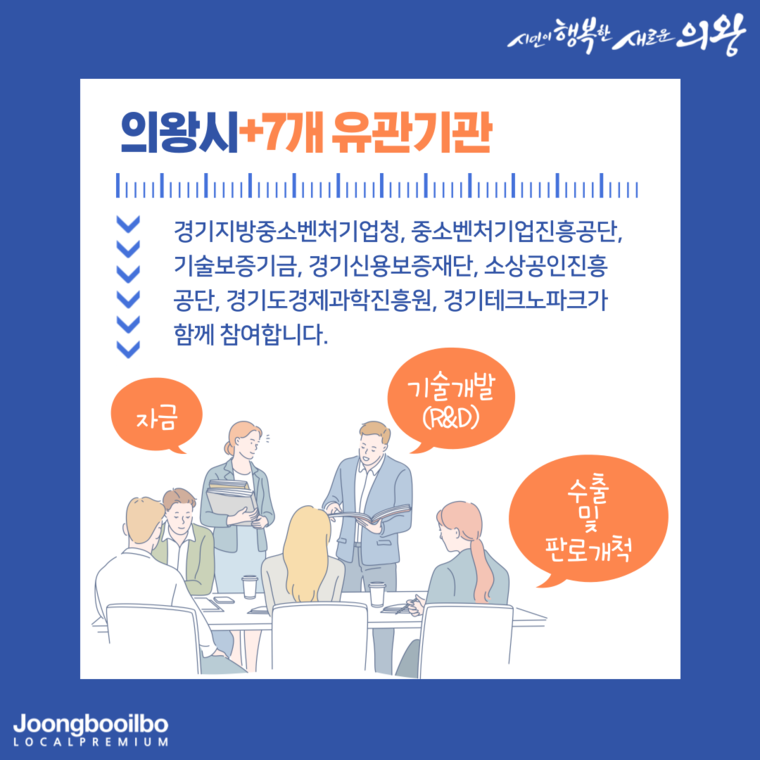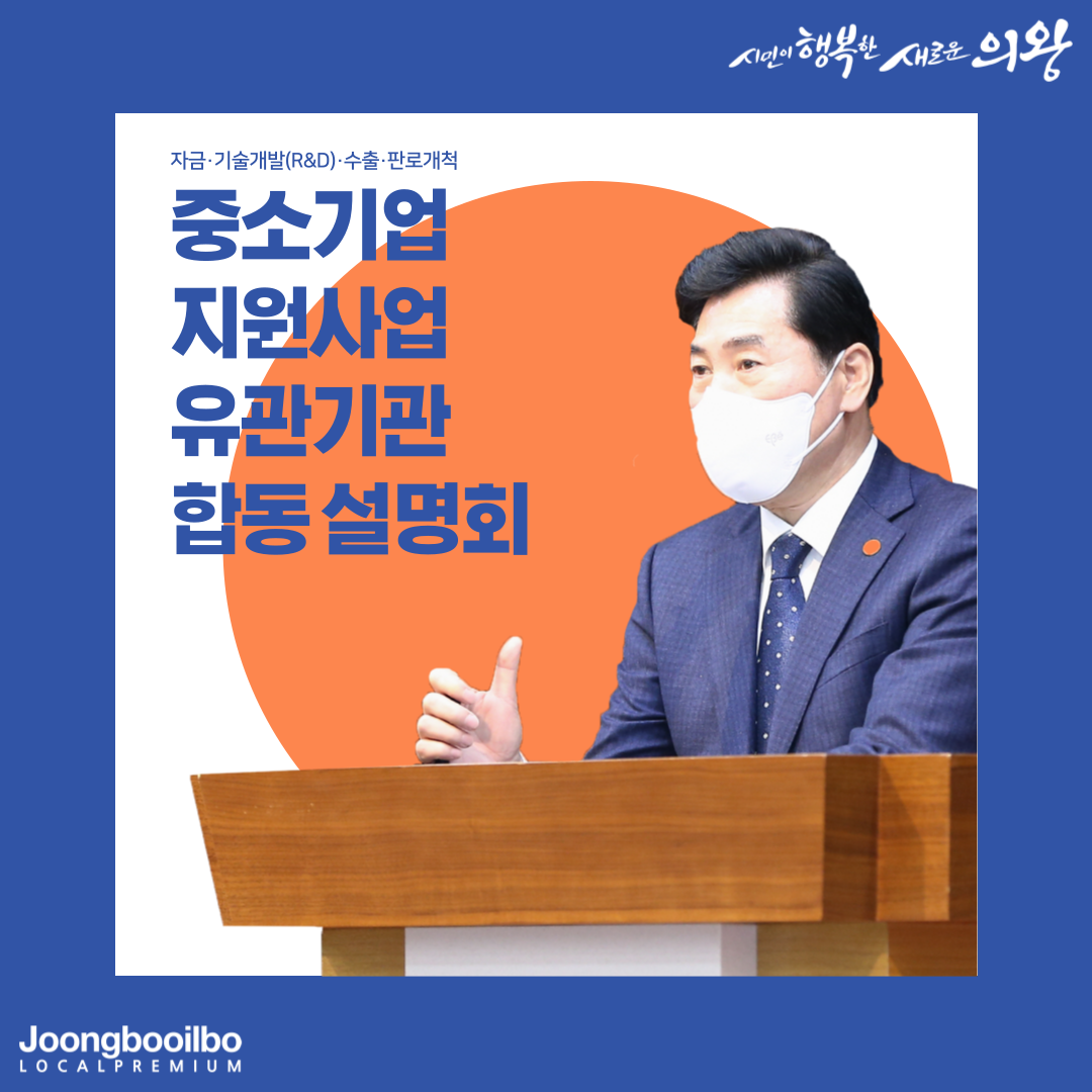 관련기사 "실질적인 지원 받는 계기 되길"…의왕시, 중소기업 지원사업 유관기관 합동 설명회 열어 의왕시는 지난 8일 의왕시청 대회의실에서 2022년도 중소기업 지원 사업에 대한 설명회를 개최했다고 9일 밝혔다.이번 설명회는 시 뿐 만 아니라 7개 유관기관인 경기지방중소벤처기업청, 중소벤처기업진흥공단, 기술보증기금, 경기신용보증재단, 소상공인진흥공단, 경기도경제과학진흥원, 경기테크노파크가 함께 관내 중소기업인들을 대상으로 자금·기술개발(R&D)·수출·판로개척 등 지원사업을 안내했다.이날 설명회에는 코로나19로 인해 사전신청자 49명에 한해 참석이 가능했으며, 참석하지 못한 기업인들을 위해서 유튜브(의왕시청) 채널을 통해 실시간