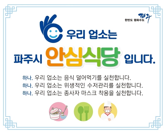 파주시는 식사문화 개선을 위해 지난해에 이어 올해도 안심식당 지정업소를 운영한다고 14일 밝혔다.