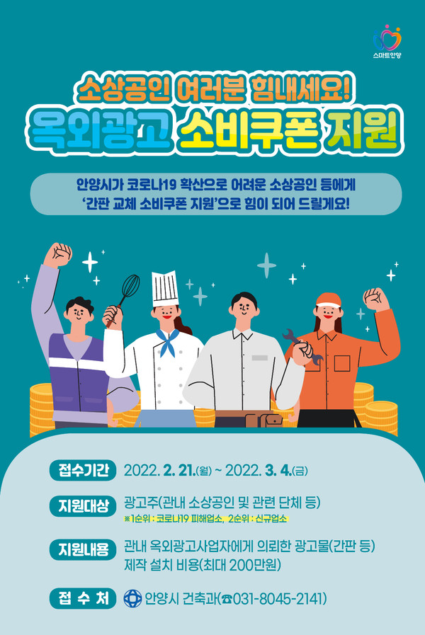 안양시는 코로나19 확산에 따라 침체된 지역 소상공인, 옥외광고사업자 등의 활력 제고를 위해 작년에 이어 올해도 '2022년 옥외광고 소비쿠폰 지원사업'을 시행한다.
