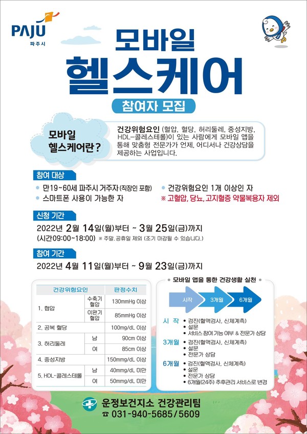 파주시 운정광역보건지소는 내달 25일까지 비대면 건강관리 서비스인 ‘모바일 헬스케어’ 6기 참여자 150명을 모집한다고 15일 밝혔다.