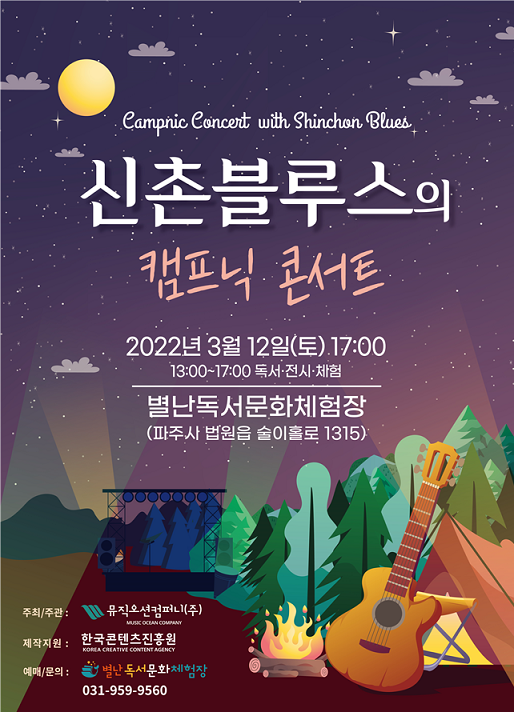 별난독서문화체험장 잔디마당에서 개최되는 '신촌블루스의 캠프닉 콘서트'는 내달 12일 오후 5시부터 2시간 동안 진행된다. 또 사전행사로 오후 1시부터 캠핑, 독서, 전시, 체험활동도 함께 진행된다.