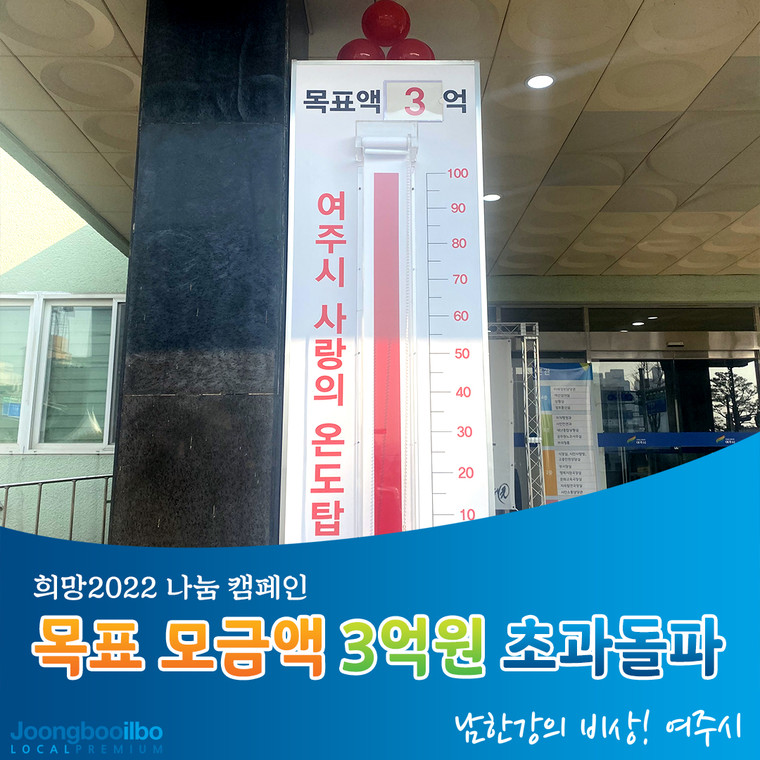 여주시와 경기 사회복지공동모금회가 연말연시 나눔 문화 활성화를 위해 주관한 ‘희망2022 나눔 캠페인’이 목표액인 3억원(100℃)을 초과한 5억 1천여만 원(172℃)을 달성했다.