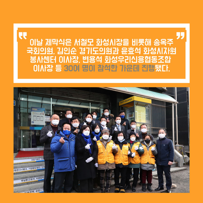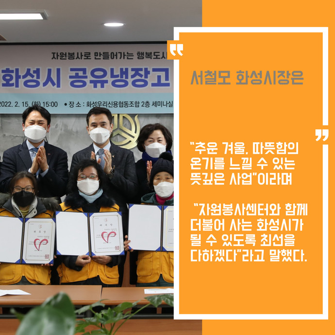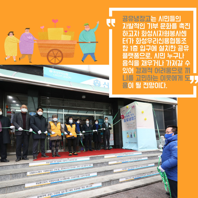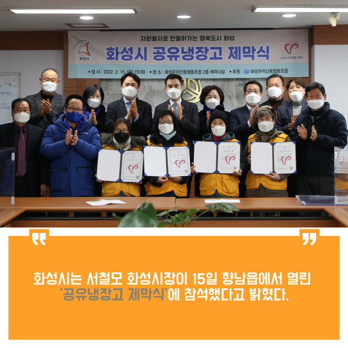 관련기사 “온기를 전하는 사업”… 서철모 화성시장, ‘공유냉장고 제막식’ 참석 화성시는 서철모 화성시장이 15일 향남읍에서 열린 ‘공유냉장고 제막식’에 참석했다고 밝혔다.이날 제막식은 서철모 화성시장을 비롯해 송옥주 국회의원, 김인순 경기도의원과 윤효석 화성시자원봉사센터 이사장, 변용석 화성우리신용협동조합 이사장 등 30여 명이 참석한 가운데 진행됐다.공유냉장고는 시민들의 자발적인 기부 문화를 촉진하고자 화성시자원봉사센터가 화성우리신용협동조합 1층 입구에 설치한 공유플랫폼으로, 시민 누구나 음식을 채우거나 가져갈 수 있어 경제적 어려움으로 끼니를 고민하는 이웃에게 도움이 될 전망이다.서철모 화성시장은 “추운