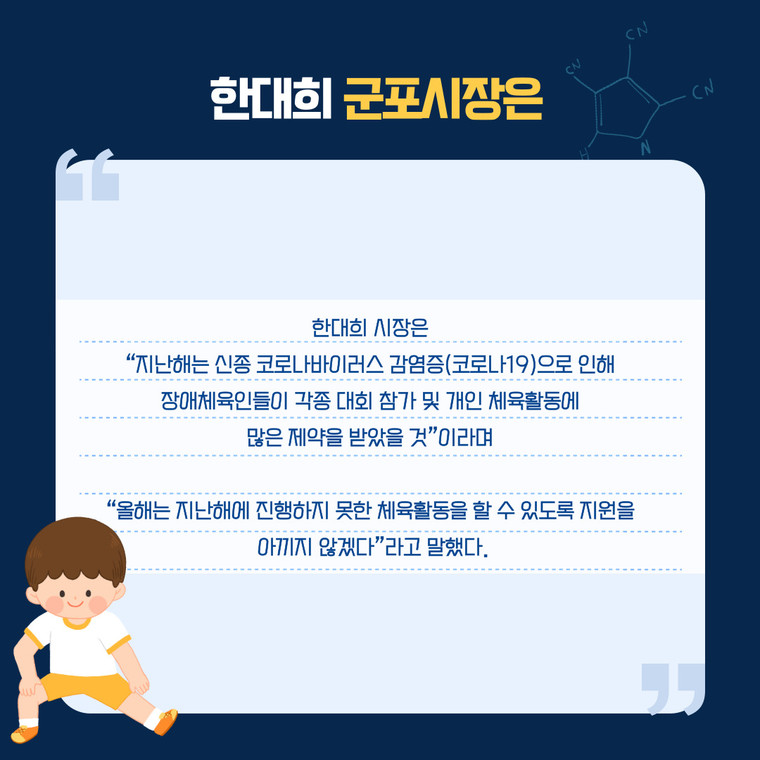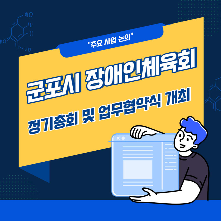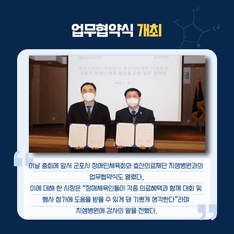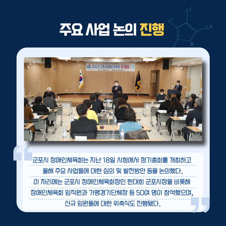 관련기사 “주요 사업 논의”… 군포시 장애인체육회, 정기총회 및 업무협약식 개최 군포시 장애인체육회는 지난 18일 시청에서 정기총회를 개최하고 올해 주요 사업들에 대한 심의 및 발전방안 등을 논의했다.이 자리에는 군포시 장애인체육회장인 한대희 군포시장을 비롯해 장애인체육회 임직원과 가맹경기단체장 등 50여 명이 참석했으며, 신규 임원들에 대한 위촉식도 진행됐다.한대희 시장은 “지난해는 신종 코로나바이러스 감염증(코로나19)으로 인해 장애체육인들이 각종 대회 참가 및 개인 체육활동에 많은 제약을 받았을 것”이라며 “올해는 지난해에 진행하지 못한 체육활동을 할 수 있도록 지원을 아끼지 않겠다”라고 말했다.이날 총회