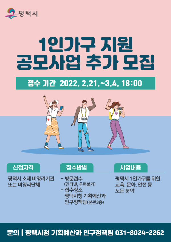공모를 희망하는 단체나 법인은 평택시청 기획예산과 인구정책팀으로 방문접수하면 된다. 선정된 사업은 사업별 4백만원의 범위 내에서 예산을 지원할 계획이다.