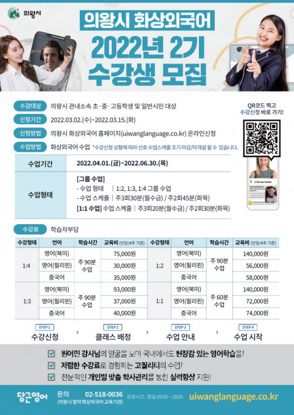 의왕시가 내달 2일부터 15일까지 원어민 화상외국어 학습 2기 수강생을 모집한다고 24일 밝혔다.