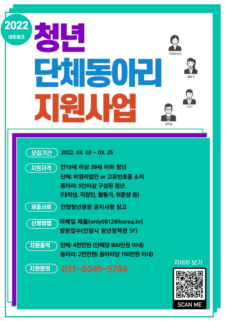 안양시가 오는 25일까지 '2022년 청년네트워크 활성화를 위한 청년단체·동아리 지원 사업' 에 참여할 청년을 모집한다.