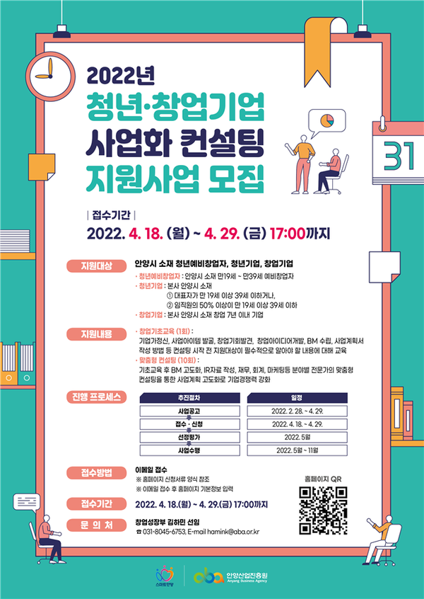 안양산업진흥원은 청년창업의 첫걸음으로 창업지원 및 기업 애로해결을 위한 맞춤형 전문가를 지원하는 '2022년 청년·창업기업 사업화 컨설팅 지원사업'의 참여자 및 초기기업을 모집한다.