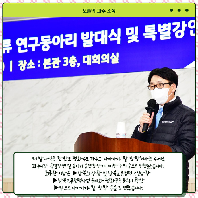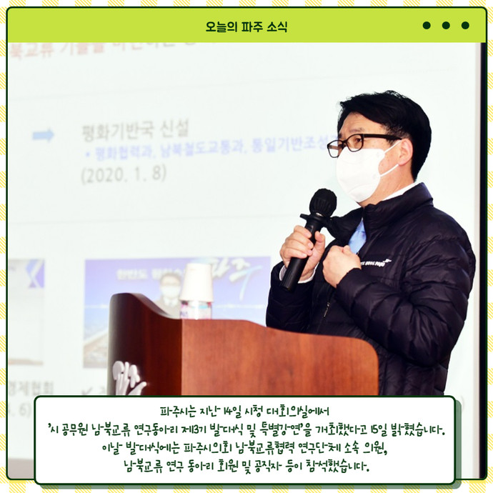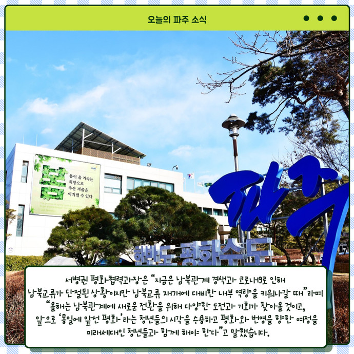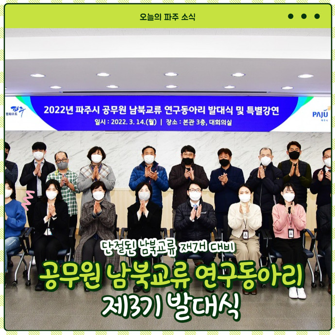 관련기사 "단절된 남북교류 재개 대비"…파주시, 공무원 남북교류 연구동아리 제3기 발대식 홍지예 기자 hjy@joongboo.com 기자페이지 저작권자 © 중부일보 - 경기·인천의 든든한 친구 무단전재 및 재배포 금지 SNS 기사보내기 페이스북(으)로 기사보내기 트위터(으)로 기사보내기 카카오톡(으)로 기사보내기 네이버밴드(으)로 기사보내기 URL복사(으)로 기사보내기