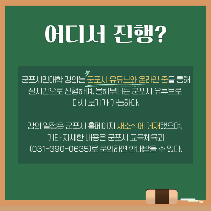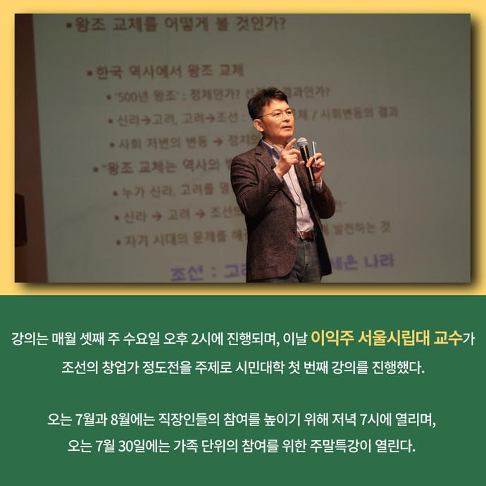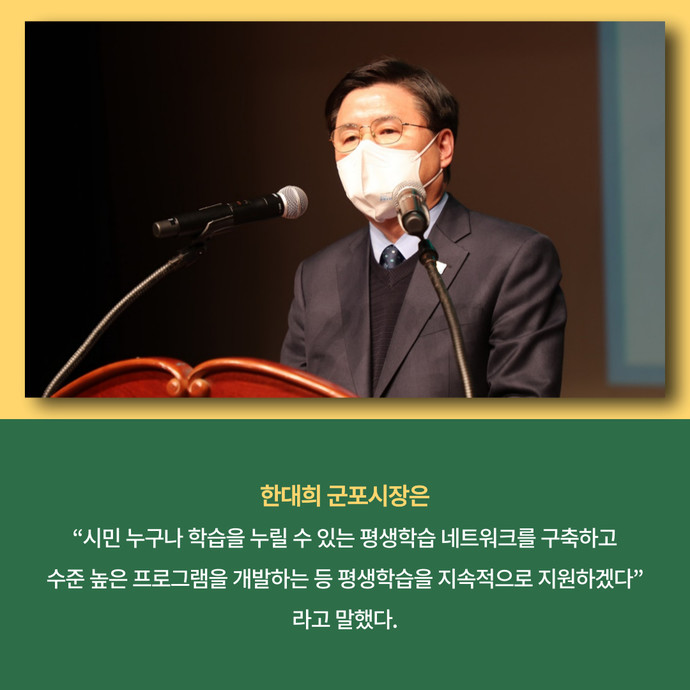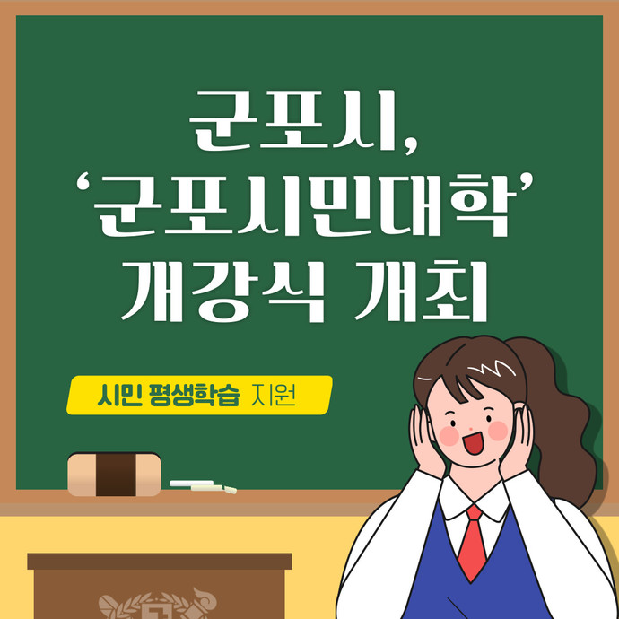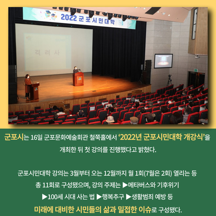 관련기사 “시민 평생학습 지원”… 군포시, ‘2022년 군포시민대학 개강식’ 개최 군포시는 16일 군포문화예술회관 철쭉홀에서 ‘2022년 군포시민대학 개강식’을 개최한 뒤 첫 강의를 진행했다고 밝혔다.군포시민대학 강의는 3월부터 오는 12월까지 월 1회(7월은 2회) 열리는 등 총 11회로 구성됐으며, 강의 주제는 ▶메타버스와 기후위기 ▶100세 시대 사는 법 ▶행복추구 ▶생활범죄 예방 등 미래에 대비한 시민들의 삶과 밀접한 이슈로 구성됐다.강의는 매월 셋째 주 수요일 오후 2시에 진행되며, 이날 이익주 서울시립대 교수가 조선의 창업가 정도전을 주제로 시민대학 첫 번째 강의를 진행했다.오는 7월과 8월에는 직장인