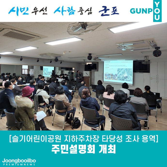 군포시는 지난 16일 산본2동 행정복지센터에서 인근 아파트 동대표와 통·반장, 산본시장 관계자 및 지역구 도·시의원 등이 참석한 가운데 ‘슬기어린이공원 지하주차장 타당성 조사 용역’과 관련한 주민설명회를 개최했다고 21일 밝혔다.