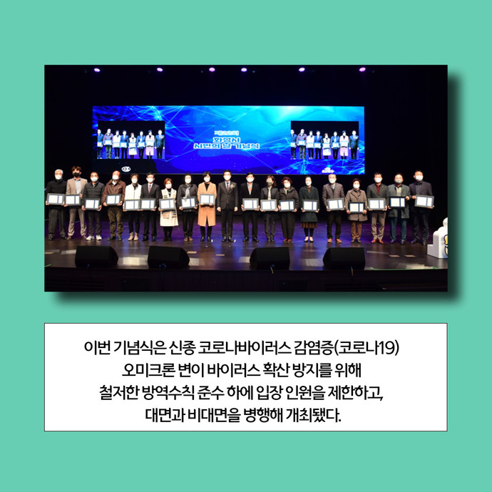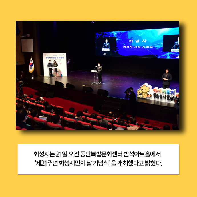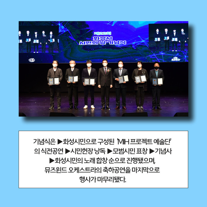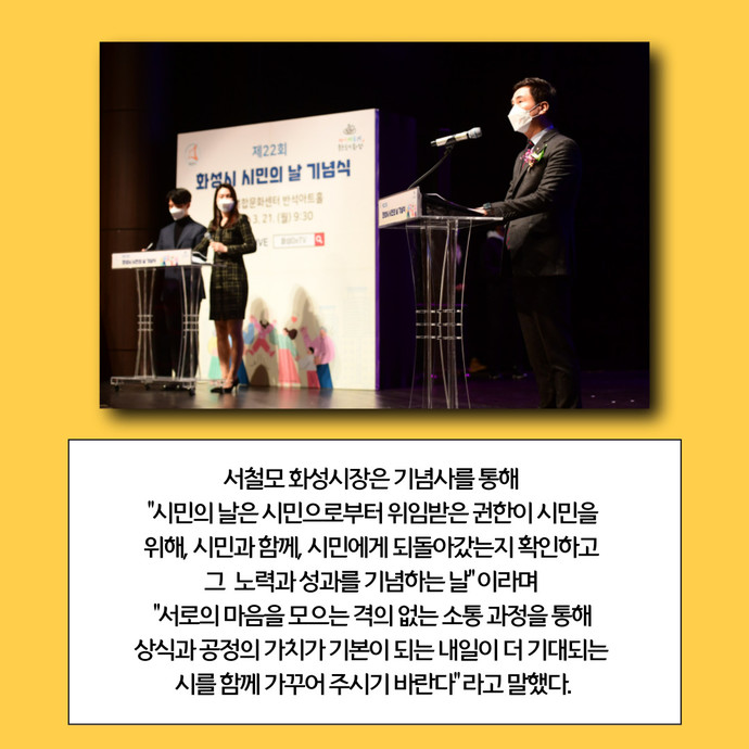 관련기사 “시의 주인공은 시민”… 화성시, ‘제21주년 화성시민의 날 기념식’ 개최 화성시는 21일 오전 동탄복합문화센터 반석아트홀에서 ‘제21주년 화성시민의 날 기념식’을 개최했다고 밝혔다.이번 기념식은 신종 코로나바이러스 감염증(코로나19) 오미크론 변이 바이러스 확산 방지를 위해 철저한 방역수칙 준수 하에 입장 인원을 제한하고, 대면과 비대면을 병행해 개최됐다.기념식은 ▶화성시민으로 구성된 ‘MIH 프로젝트 예술단’의 식전공연 ▶시민헌장 낭독 ▶모범시민 표창 ▶기념사 ▶화성시민의 노래 합창 순으로 진행됐으며, 뮤즈윈드 오케스트라의 축하공연을 마지막으로 행사가 마무리됐다.서철모 화성시장은 기념사를 통해 “시민의