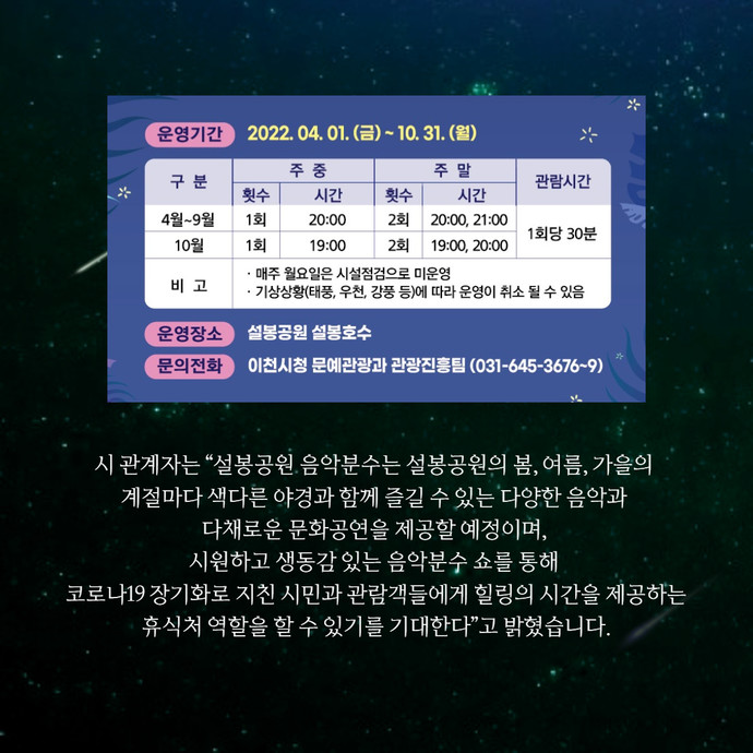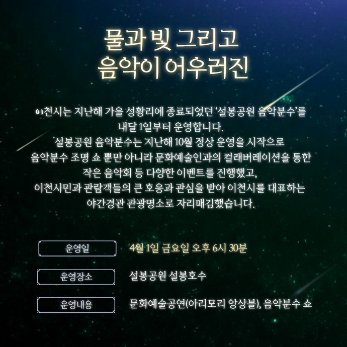 관련기사 "코로나로 지친 시민에 힐링을"… 이천시, 설봉공원 음악분수 4월 1일부터 운영 재개 홍지예 기자 hjy@joongboo.com 기자페이지 저작권자 © 중부일보 - 경기·인천의 든든한 친구 무단전재 및 재배포 금지 SNS 기사보내기 페이스북(으)로 기사보내기 트위터(으)로 기사보내기 카카오톡(으)로 기사보내기 네이버밴드(으)로 기사보내기 URL복사(으)로 기사보내기