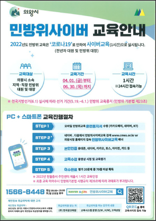의왕시는 내달 1일부터 6월 30일까지 2022년 민방위 사이버교육을 실시한다고 24일 밝혔다.
