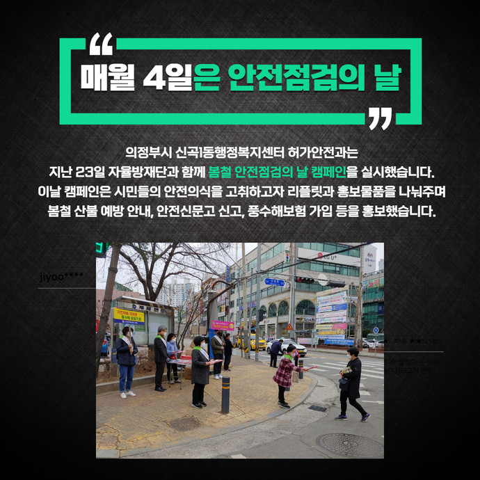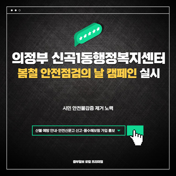 관련기사 "시민 안전불감증 제거 노력"…의정부시 신곡1동행정복지센터, 봄철 안전점검의 날 캠페인 홍지예 기자 hjy@joongboo.com 기자페이지 저작권자 © 중부일보 - 경기·인천의 든든한 친구 무단전재 및 재배포 금지 SNS 기사보내기 페이스북(으)로 기사보내기 트위터(으)로 기사보내기 카카오톡(으)로 기사보내기 네이버밴드(으)로 기사보내기 URL복사(으)로 기사보내기
