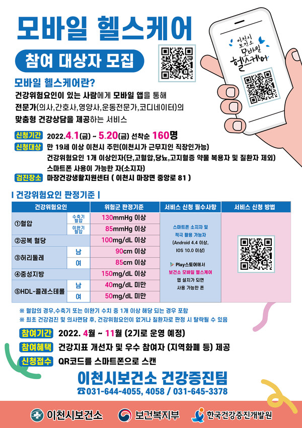 비대면 건강서비스인 모바일 헬스케어사업은 건강위험요인(혈압, 공복혈당, 중성지방, 허리둘레, HDL 콜레스테롤)을 1개 이상 보유한 만19세 이상 이천 시민 및 직장이 이천시인 직장인이라면 신청이 가능하다.