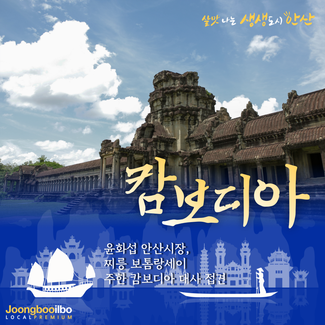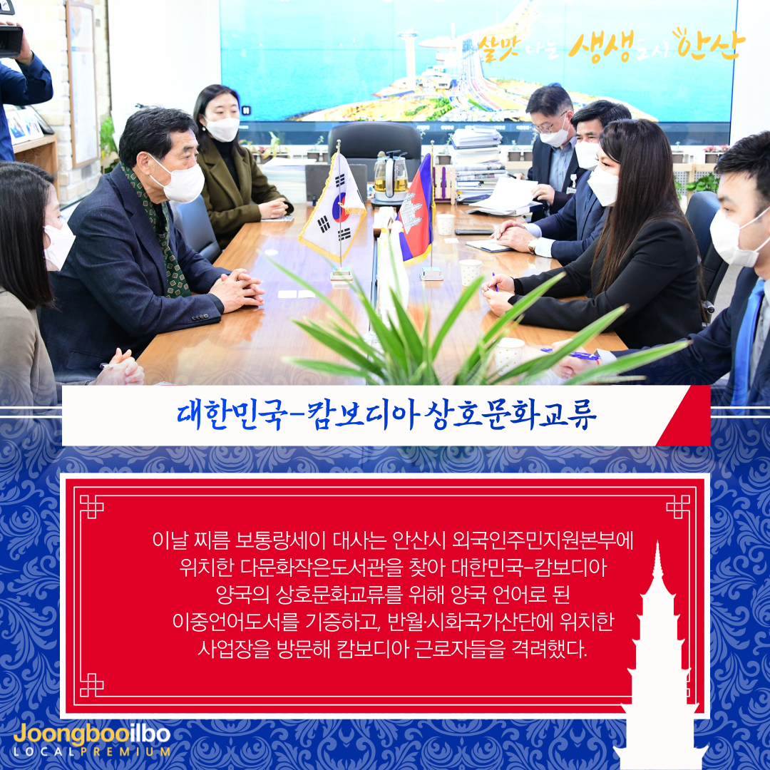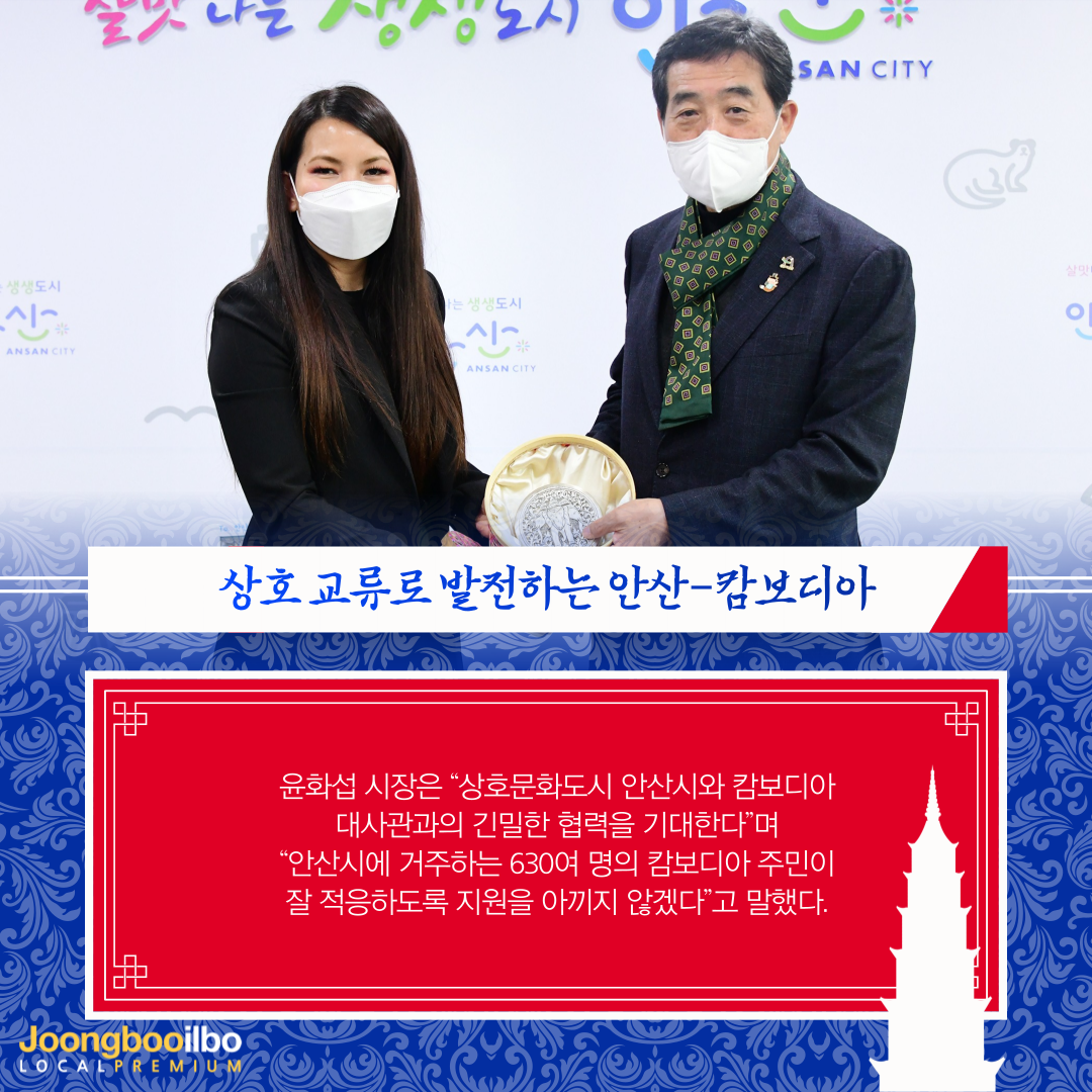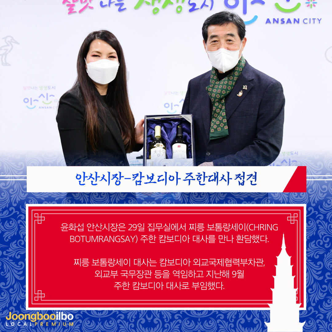 관련기사 "잘 적응하도록 지원 아끼지 않을 것"…윤화섭 시장, 찌릉 보톰랑세이 주한 캄보디아 대사 접견 윤화섭 안산시장은 29일 집무실에서 찌릉 보톰랑세이(CHRING BOTUMRANGSAY) 주한 캄보디아 대사를 만나 환담했다.찌릉 보톰랑세이 대사는 캄보디아 외교국제협력부차관, 외교부 국무장관 등을 역임하고 지난해 9월 주한 캄보디아 대사로 부임했다.이날 찌름 보통랑세이 대사는 안산시 외국인주민지원본부에 위치한 다문화작은도서관을 찾아 대한민국-캄보디아 양국의 상호문화교류를 위해 양국 언어로 된 이중언어도서를 기증하고, 반월·시화국가산단에 위치한 사업장을 방문해 캄보디아 근로자들을 격려했다.윤화섭 시장은 “상호문화도시 안산시와 캄보디