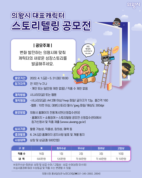 응모는 내달 31일까지 전 국민 누구나 참가할 수 있으며, 스토리를 시나리오(글)나 웹툰으로 제작하면 된다. 희망자는 의왕시청 홈페이지(소통참여-신청접수센터-스토리텔링 공모전)에 게시된 참가신청서를 작성한 뒤 주제에 맞는 작품과 함께 제출하면 된다.