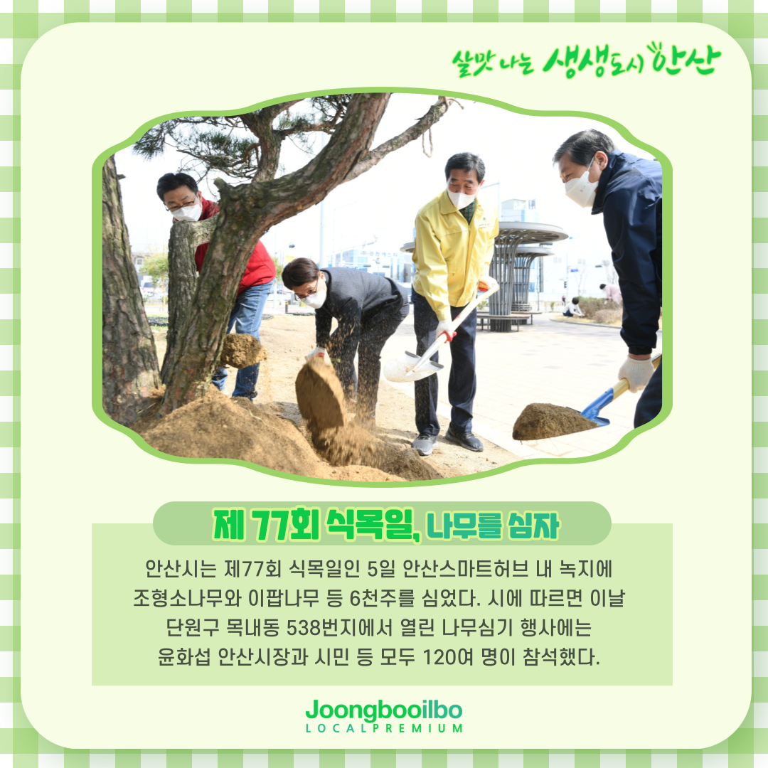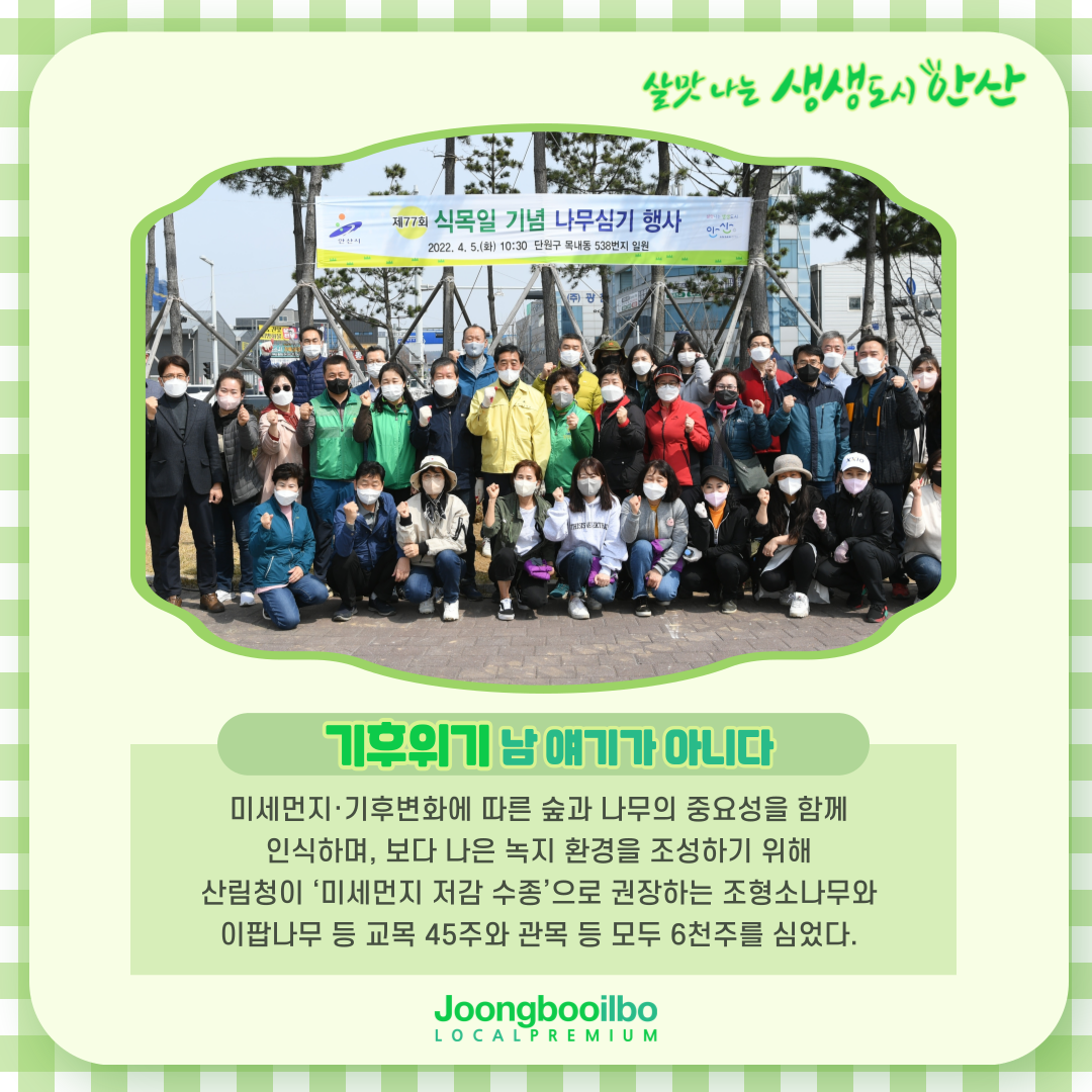 관련기사 "미래세대 위해"…안산시, 식목일 기념 나무 6천주 식재 안산시는 제77회 식목일인 5일 안산스마트허브 내 녹지에 조형소나무와 이팝나무 등 6천주를 심었다.시에 따르면 이날 단원구 목내동 538번지에서 열린 나무심기 행사에는 윤화섭 안산시장과 시민 등 모두 120여 명이 참석했다.이들은 미세먼지·기후변화에 따른 숲과 나무의 중요성을 함께 인식하며, 보다 나은 녹지 환경을 조성하기 위해 산림청이 ‘미세먼지 저감 수종’으로 권장하는 조형소나무와 이팝나무 등 교목 45주와 관목 등 모두 6천주를 심었다.윤화섭 시장은 “앞으로도 꾸준히 산림자원 육성에 힘써 미래세대를 생각하는 쾌적한 산림환경 조