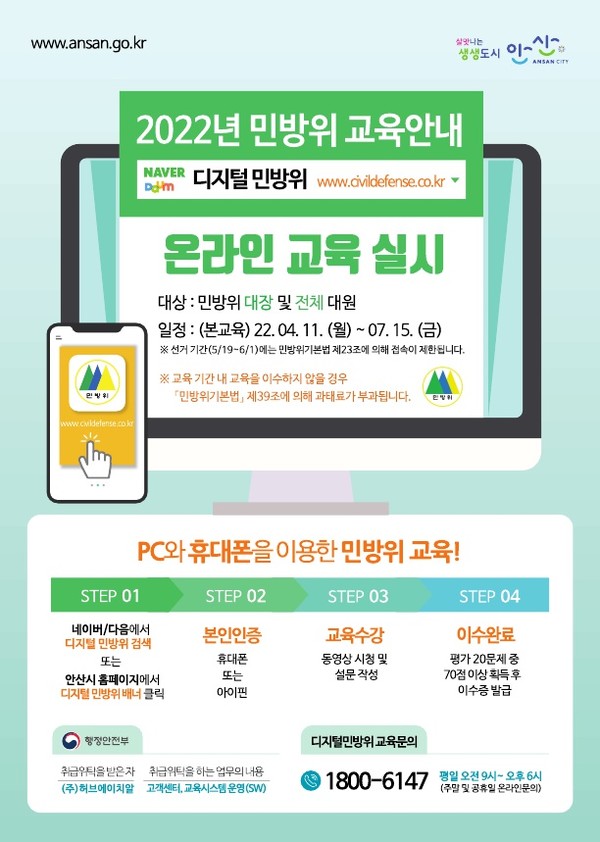 안산시는 신종 코로나바이러스 감염증(코로나19) 확산세가 지속됨에 따라 작년에 이어 올해도 민방위 교육을 사이버로 추진한다고 11일 밝혔다.