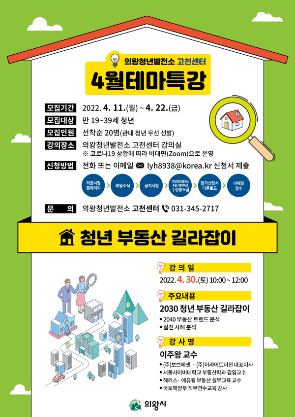 시에 따르면 30명 이내로 모집할 예정이며, 대상은 만19세 이상 39세 이하 의왕시에 주민등록을 두거나, 의왕시 소재 사업장 또는 학교에 재학 또는 휴학 중인 청년이면 지원할 수 있다. 단, 현재 시 청년정책위원회 위원으로 활동 중인 청년은 지원할 수 없다.