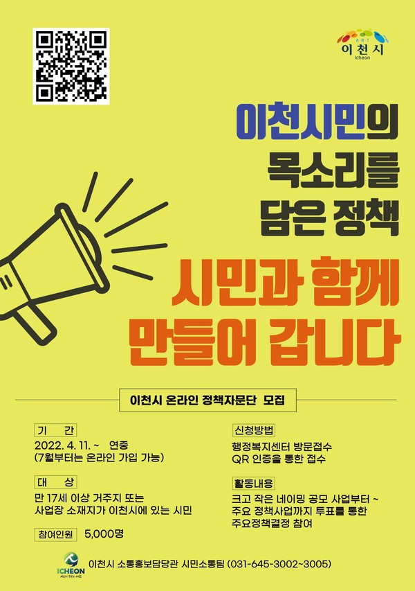 이천시는 이천시민의 정책참여 기회를 확대하기 위한 이천시 온라인 정책자문단을 5천 명 모집한다고 19일 밝혔다.