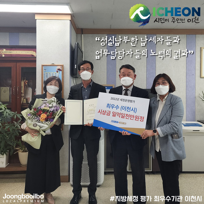 이천시가 경기도 주관으로 실시한 ‘2022년(2021년 실적) 지방세정 운영 평가’에서 최우수기관으로 선정돼 표창과 함께 시상금 1억1천만을 받는 쾌거를 일궜다.