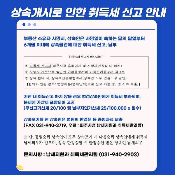 파주시는 상속인을 대상으로 ‘상속부동산 취득세 신고납부’를 기한 내에 신고·납부해 가산세 부담이 발생하지 않도록 해 줄 것을 홍보했다.